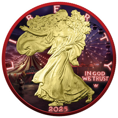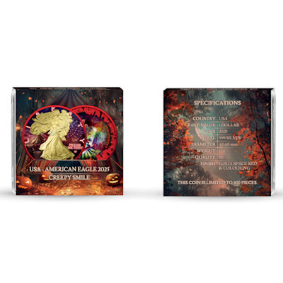 | <<< USA - 1 USD Silver Eagle: Halloween Creepy Smile 2025 - 1 Oz Silber Gilded Color | |