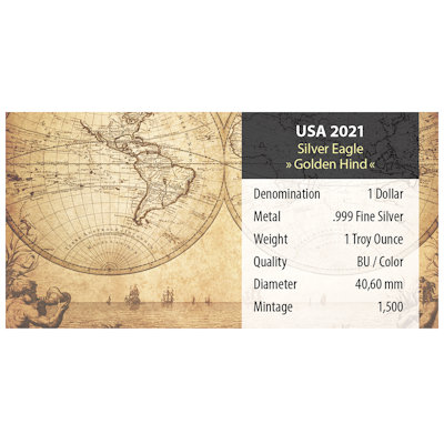 Der American Silver Eagle gehört zu den klassischen modernen Anlagemünzen und wird seit 1986 von der United States Mint produziert. Es handelt sich hier um die 5. Ausgabe aus dem Jahr 2021 aus der Serie Zeitalter der Segler und zeigt die Golden Hind. Die Münze besteht aus 1 Oz Feinsilber in der Prägequalität Stempelglanz und ist aufwendig coloriert sowie auf nur 1.500 Stück weltweit streng limitiert. Die Auslieferung erfolgt gekapselt mit Produktkarte.