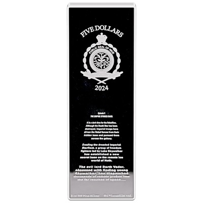 Dieses Original Star Wars(TM) Poster von Das Imperium schlägt zurück(TM) (The Empire strikes back(TM)) auch bekannt als Episode V und der zweite Kinofilm der Star Wars Saga kommt als 3 Oz Feinsilbermünze in der höchsten Prägequalität Polierte Platte mit aufwendiger Kolorierung. Die Auflage ist weltweit auf nur 800 Stück streng limitiert.