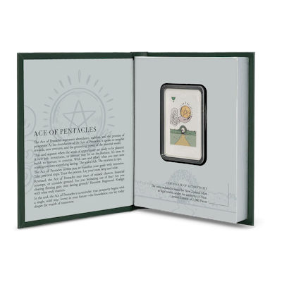 Die vierte Karte wird gezogen. Das Ass der Münzen ergänzt die Tarot-Serie der Kleinen Arkana aus 1 Oz Feinsilber mit einem Design, das Wohlstand, Erdung und Neuanfänge symbolisiert. Das Kunstwerk ist von einem hochglänzenden Rahmen umgeben, und ein schimmerndes grünes Dreieck in der oberen linken Ecke repräsentiert die Erde, das alchemistische Symbol der Münzen.