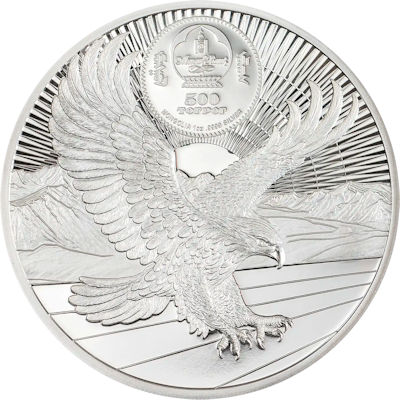 Im Hintergrund der Münze breiten sich strahlende Sonnenlinien aus, die symbolisch sowohl für Macht als auch für Erleuchtung stehen. Die umliegende Landschaft ergänzt das ehrwürdige Motiv durch die Darstellung der Berge und Ebenen, die Chinggis Khaans Reich einst formten. Die Vorderseite zeigt einen majestätischen Adler – das klassische Jagdtier der mongolischen Kultur. In der Mongolei steht der Adler für Stärke, Mut, Freiheit und kulturelles Erbe. Besonders in der Westmongolei wird diese Bedeutung durch die jahrhundertealte Tradition des Adlerfangs und der Jagd mit Steinadlern verkörpert – eine Verbindung zwischen Mensch und Tier, die auf Respekt, Symbiose und tiefer spiritueller Verbundenheit mit der Natur beruht.