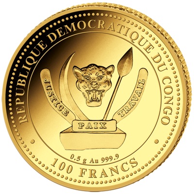 Technische Daten: Ausgabeland: Kongo Prägeanstalt: Ausgabejahr: 2025 Nennwert: 100 Francs Material: Gold Gewicht: 0,50000g Durchmesser: 11,00 mm Auflage: 2.000 Stück Prägequalität: Polierte Platte Verpackung: Gekapselt |