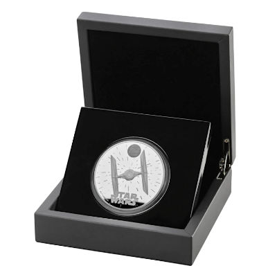 Dies ist eine neue Star Wars(TM) Ausgabe der Royal Mint. Die 5 Oz Feinsilbermünze zeigt den TIE Fighter.