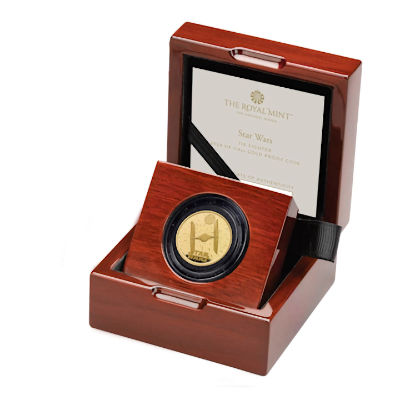 Dies ist eine neue Star Wars(TM) Ausgabe der Royal Mint. Die 1/4 Oz Feingoldmünze zeigt TIE Fighter.