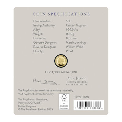 Technische Daten: Ausgabeland: Großbritannien Prägeanstalt: The Royal Mint Ausgabejahr: 2026 Nennwert: 0,50 Pfund Material: Gold Gewicht: 0,80000g Durchmesser: 8,00 mm Auflage: 1.008 Stück Prägequalität: Polierte Platte Verpackung: Gekapselt im Original-Etui mit Echtheitszertifikat |