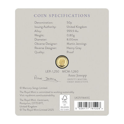 Feiern Sie einen der größten Musiker aller Zeiten mit der neuesten Münze der Music Legends-Kollektion. Die erste britische Münze, die ausschließlich Freddie Mercury gewidmet ist. Die Rückseite zeigt die Ikone auf dem Höhepunkt seiner Karriere, begleitet von der Unterschrift des Singer-Songwriters.