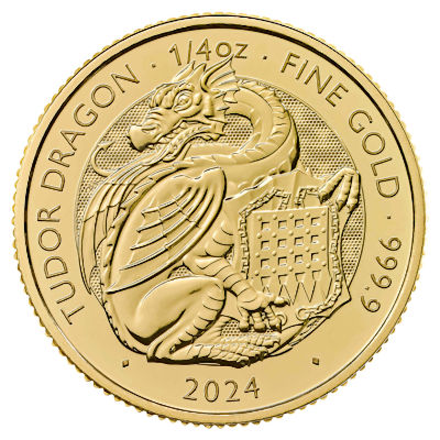 Es handelt sich hier um die 8. Ausgabe der Serie Tudor Beasts mit dem Motiv Queen`s Lion. Die Münze besteht aus 1/4 Oz Feingold in Stempelglanz. |