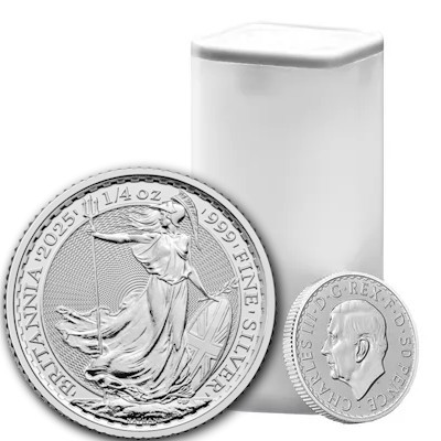Es handelt sich hier um die Britannia von 2025 in der Größe von 1/4 Oz Feinsilber. Sie kaufen eine gesamte Tube mit 19 Münzen und einem Gesamgewicht von nicht ganz 150 Gramm Feinsilber. |