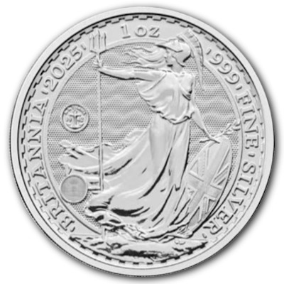 Die 2025er Britannia Silberanlagemünze zeigt die stehende Britannia mit Zweig und Schild in der linken und Dreizack in der rechten Hand, den Blick in die Ferne gerichtet mit wehendem Gewand. Die Nennwert Seite zeigt zum zweiten mal König Charles III. |