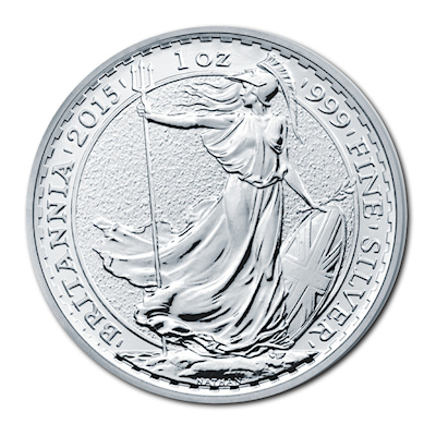 Die 2015er Britannia Silberanlagemünze zeigt die stehende Britannia mit Zweig und Schild in der linken und Dreizack in der rechten Hand, den Blick in die Ferne gerichtet mit wehendem Gewand. |